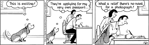 There are several things wrong with this comic. One, I don't think dogs need passports. Not to say that they shouldn't. The TSA probably would not let Afghan sheepdogs on their flights. Or if they did, all the other dogs would make eyes at each other. Second, Fred, you look fine. Don't be self conscious. All the artist is doing is giving dogs another reason to not finish their bowl of puppy chow, and not just because they're eying that package of Beggin' Strips or Snausages on the counter. Every dog is beautiful. Third, it's not funny. This will be a common theme in my analysis. Just. Not. Funny.