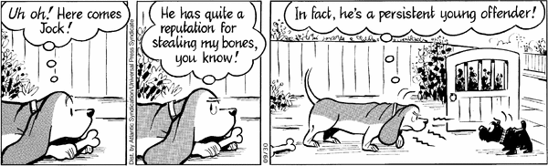 Poor Fred. Everyone is out to steal his bones. I don't like how the author broke the fourth wall, inserting 'you know' into the second panel. It's as Fred is talking to us. It's enough to believe that a dog has coherent thoughts, in English no less, but to believe that he is talking to me? You've lost me. I am sorry that Fred feels his bone is threatened, but why then, as Jock nears, does he leave it lying in the yard. That's a rookie mistake. When a thief comes around, you guard your possessions tighter, you don't confront them and leave what they want unguarded. If Jock does this frequently, as Fred claims, Fred should have refined his bone-protecting technique. Maybe it's his failure here that leads to the constant theft. Fred, step up your game.