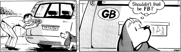 No Fred, it should not. Although I imagine the GB stands for "Great Britain," it can stand for whatever you like. That's part of the fun. If you want it to address you, perhaps "Good Boy" or maybe "Great Basset." Or if you're of another mind, "Green bananas" or "Goofy Ballerinas." The list could go on and on. But if certainly does not refer. This also raises the point that Fred Basset is a terrible name for a dog. Why isn't is name just Fred? You don't see people naming their children Steve Human, or even their pets Rex Goldendoodle. There's no need for Basset, and frankly, Fred should have enough. He should drop it and become a one-name person like Cher or Ichiro.