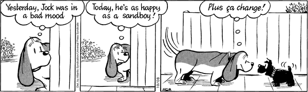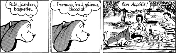 This is one of those times when I wonder if the artist truly believes that this comic is capable of making people laugh. I hope he doesn't, because that would mean his sense of humor is so skewed he may consider Shakespeare's comedies funny. I don't know why Fred is so excited about France. He's a basset hound, a breed of dog with an especially keen sense of smell. And France stinks: the people, the cheese, the anti-Americanism. Fred should be dreading this trip from the start, and let's not even mention the 8 hour plane ride.