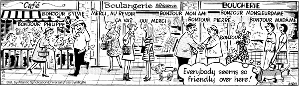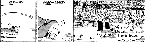 Nothing terribly wrong with the premise of this comic. The family goes to France and people are nice. And then something crazy happens...And then a French dog steals Fred's bone...and then someone says the word Banana...Nope. None of this. The entire comic is the observation that people are nice. There is NOTHING FUNNY HERE! NOTHING! I can't imagine thinking any humorous thoughts after reading this comic. Sentences are not inherently funny. Add something. Please. Please, for once, prove me wrong.