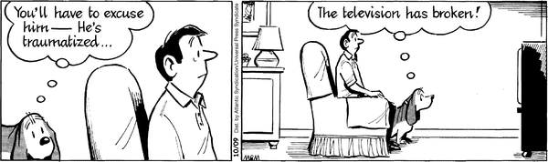 I get it. You're losing money because people are watching cartoons with 30 frames a second, not just two. Why don't you whine about it some more? That will make me want to buy your books more. I don't understand why he's watching the TV if it's broken. That does show a pretty sad existence, but then again, wouldn't you be sad if Fred Basset were your dog?